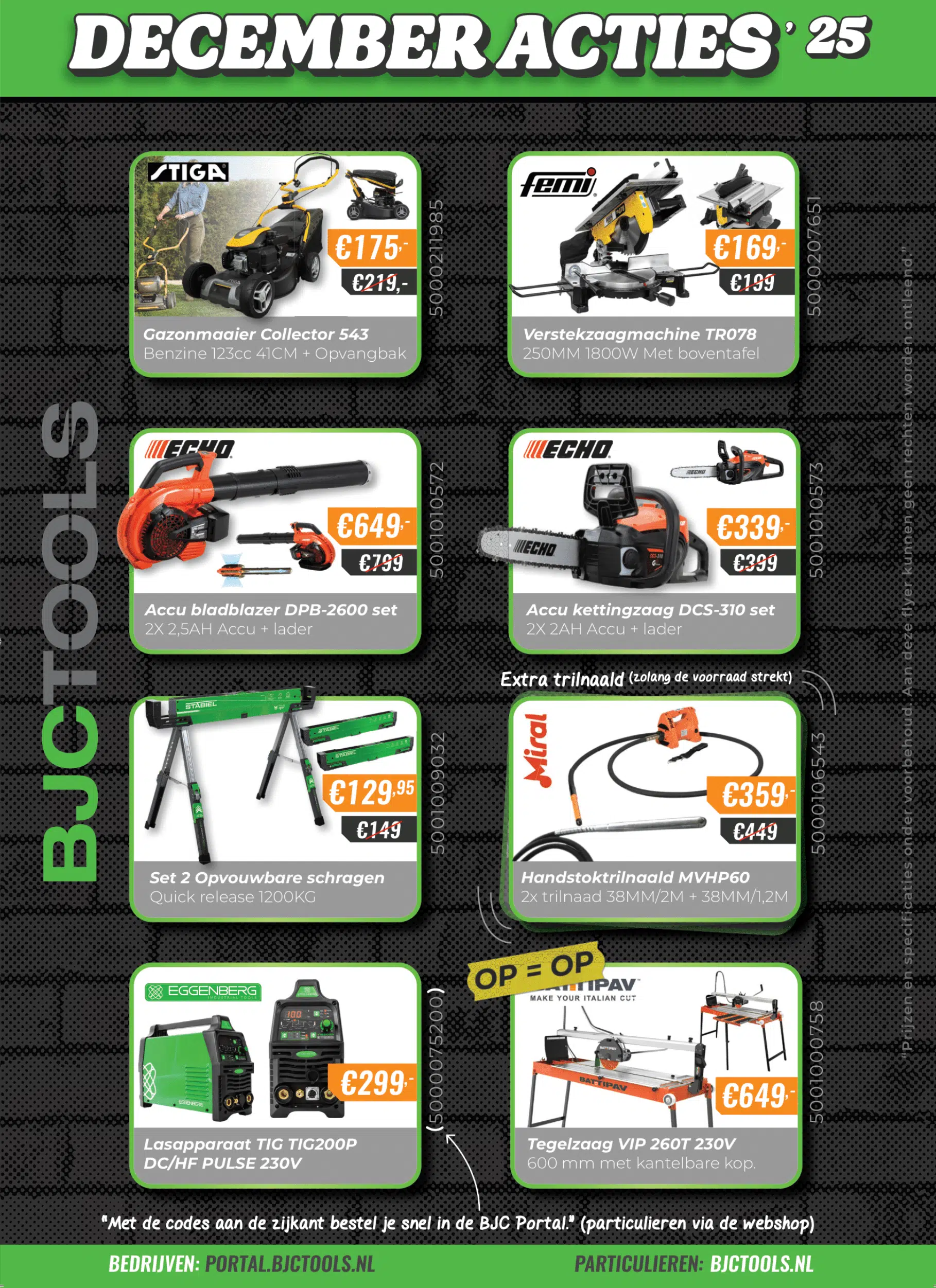 Het jaar loopt op zijn eind, maar bij BJC Tools gaan we juist een tandje harder. December staat bij ons volledig in het teken van kwaliteit, service én slimme deals. Onze jaarlijkse December Acties zitten weer bomvol krachtige machines, scherpe bundelaanbiedingen en producten die elke professional helpt om het nieuwe jaar sterk te starten.