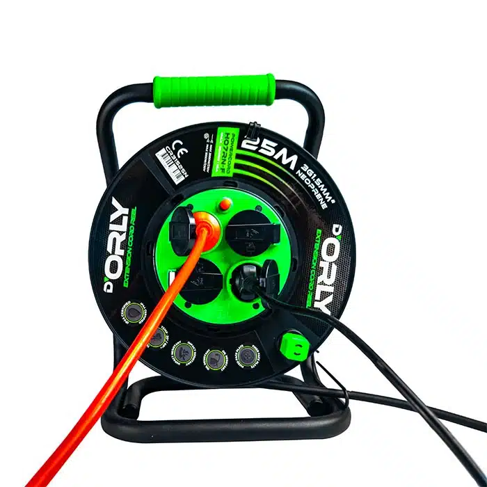 - D’Orly 3×1.5 mm² neopreen kabelhaspel 230V IP44 – verkrijgbaar in 25m en 40m: geschikt voor licht gereedschap of wanneer een standaard stroomvoorziening voldoende is.