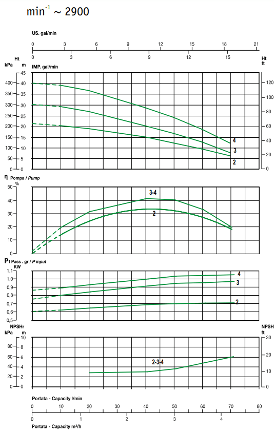 Fabrikanten van pompen verstrekken grafieken waarop de prestaties van hun pompen grafisch weergegeven worden. In deze grafieken valt af te lezen binnen welke grenzen een pomp kan presteren. Als een pomp zoveel mogelijk in het middelste deel van de grafiek kan opereren, is er een optimale balans tussen druk, debiet en levensduur van de pomp, maar afwijkingen hoeven in de praktijk niet tot problemen te leiden. De druk en het debiet staan niet los van elkaar en zijn verbonden. Meer debiet betekent een lagere druk en minder debiet een hogere druk.