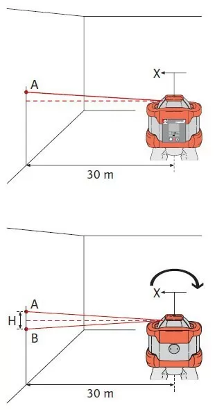 - Positioneer de laser langs de op de behuizing aangebrachte X-as en schakel de rotatielaser in. De laserstraal begint te roteren.