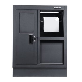 Multifunctionele stalen werkplaatskast van Pillar met lade, opbergruimte en afsluitbaar afvalbakcompartiment. Voorzien van soft-close lade en papierrolhouder voor een efficiënte en nette werkplek.