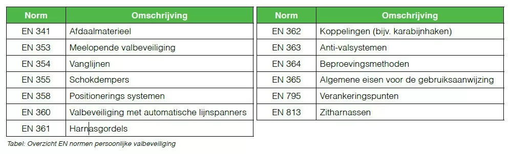 Tabel: Overzicht EN normen persoonlijke valbeveiliging.