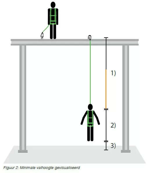 Kies wanneer mogelijk altijd een ankerpunt boven het eigen hoofd. Wanneer je jezelf op voethoogte verankert (zoals in figuur 2 hiernaast) val je immers ongeveer een lichaamslengte extra voordat je geremd wordt.