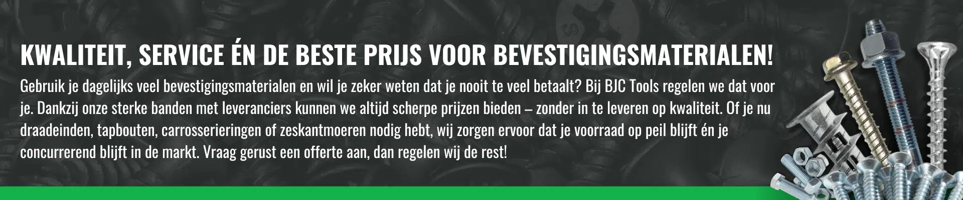 Bij BJC Tools vind je een uitgebreid assortiment bevestigingsmaterialen voor al je klussen. Of je nu op zoek bent naar bouten, moeren, slangklemmen of speciale materialen, wij hebben alles wat je nodig hebt om elke taak tot een succes te maken. Als toonaangevende leverancier bieden we bevestigingsmaterialen van topmerken zoals Mungo, Bossong en Wofix, die bekend staan om hun kwaliteit en betrouwbaarheid. Of je nu iets stevig wilt vastzetten in je woning of een groter project aanpakt, onze bevestigingsmaterialen zijn een must-have voor elke klusser. In ons assortiment vind je onder andere ankers, vlakdraadnietjes, pluggen en schroeven, allemaal overzichtelijk gerangschikt om je te helpen precies te vinden wat je zoekt!
