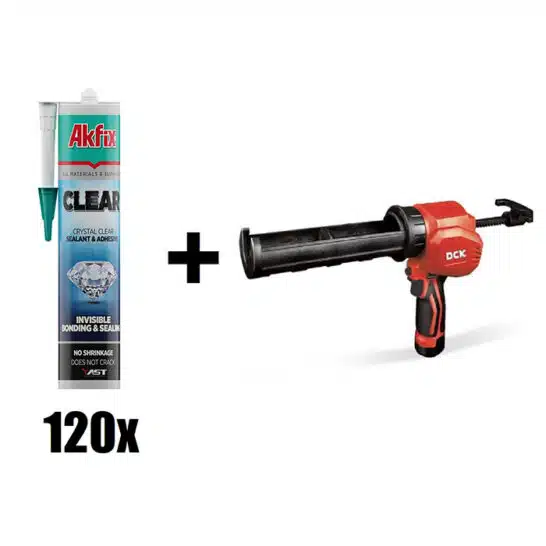 Super voordelige Actieset! Ontvang 120x AKFIX transparante hybrikit + krachtige DCK 12V accu kitspuit met 2 accu’s en snellader. T.w.v. €222,48, nu extra voordelig!