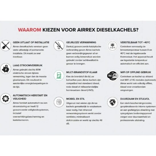 In de AIRREX-app ziet u realtime informatie, bijvoorbeeld de temperatuur in de ruimte die wordt verwarmd, de hoeveelheid diesel en of de kachel aan of uit is. Ook worden in de app informatieve berichten getoond. De kachel kan op een bestaand wifi-netwerk worden aangesloten. Als er geen wifinetwerk is, is de kachel voorzien voor een optionele 4G-router. De kachel is ook zonder wifi te gebruiken.