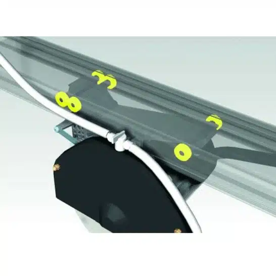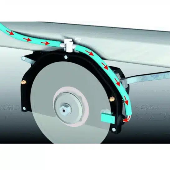 GUARD BESCHERMINGSSCHIJFParallel kantelend op de werkbank, verhoogt het de veiligheid en vermindert het de waternevel, waardoor een perfect zicht op het snijgebied ontstaat |