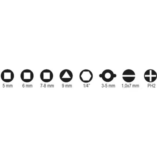 - Voorzien van dubbel inzetstuk met 1,0×7 mm inkeping en PH2 kruisuitsparing.