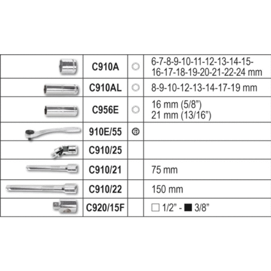 - C910A – 6-7-8-9-10-11-12-13-14-15-16-17-18-19-20-21-22-24 mm