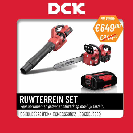 Voor grover werk in zwaar terrein. De DCK Tools Ruwterrein Set actiebundel bestaat uit een 58V kettingzaag en bladblazer, inclusief 5.0Ah accu en snellader. Ideaal voor terreinonderhoud met veel blad, takken en obstakels.