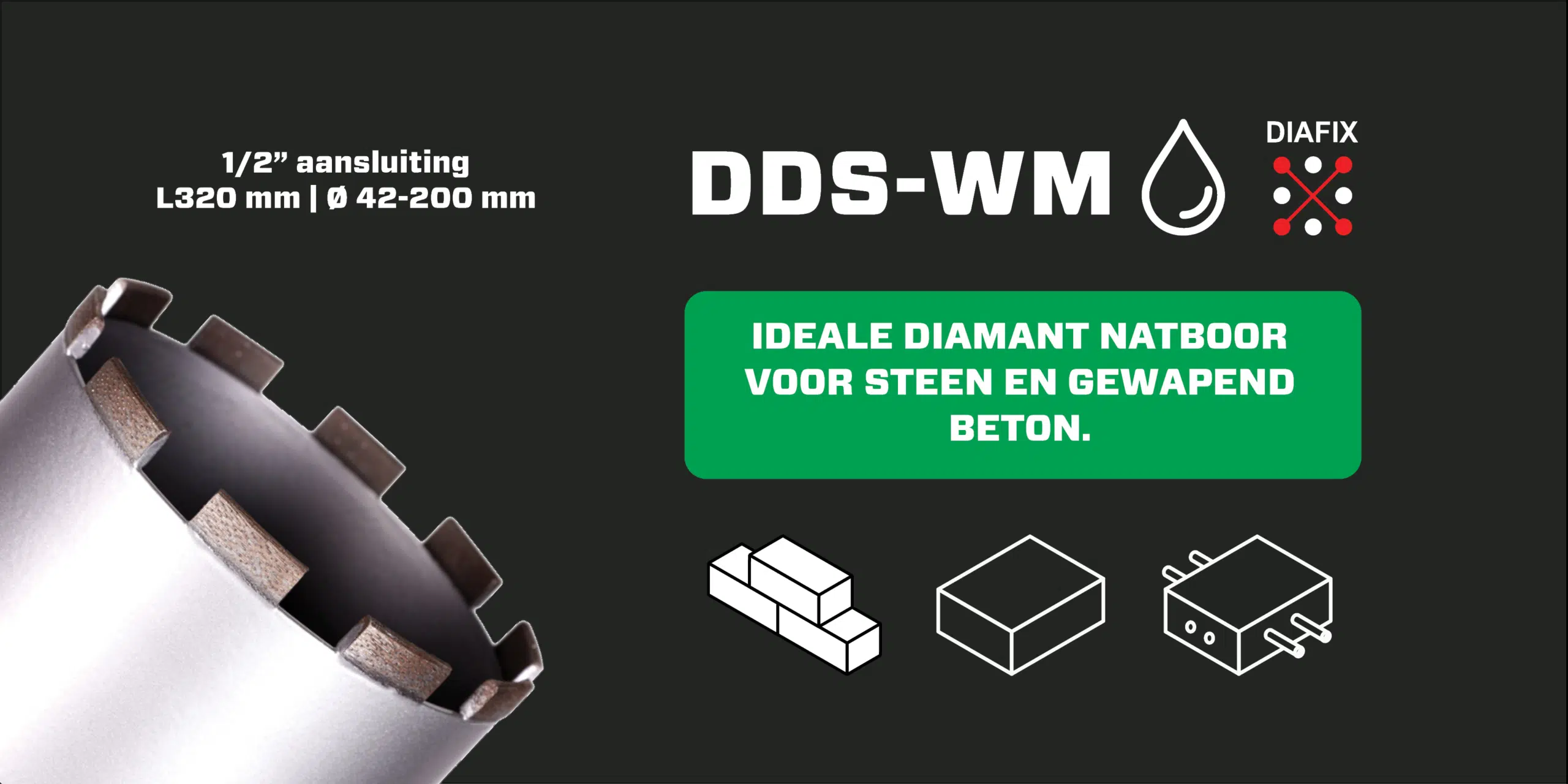 Kenmerken DiStar DDS-WM Diamantboor nat dunwandig – 1/2” x 320 mm – Ø42-200 mm