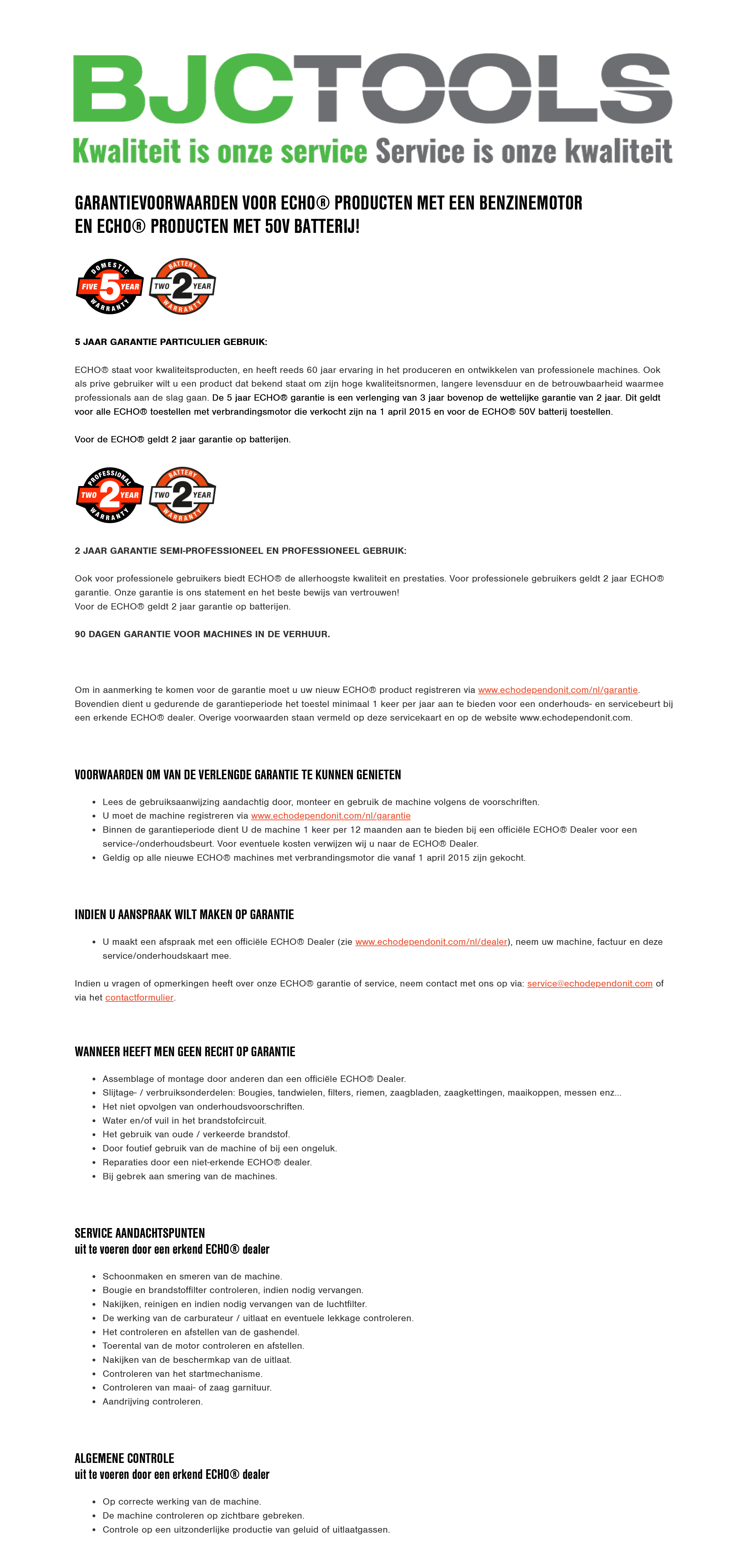 ECHO is hier een prachtig voorbeeld van; o.a. de motortechnologie van ECHO behoort tot de beste op de markt, het is een optimale balans tussen hoogwaardige prestaties en de gevraagde milieueisen. Het is dan ook geen wonder dat ECHO een garantiebeleid hanteert van 5 JAAR GARANTIE VOOR PARTICULIER GEBRUIK en 2 JAAR GARANTIE VOOR SEMIPROFESSIONEEL EN PROFESSIONEEL GEBRUIK.