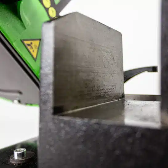 Aan de aanvoerzijde (links) wordt je materiaal vastgehouden door de klem van de machine. Steekt er aan de afvoerzijde veel uit? Ondersteun dit dan op gelijke hoogte zodat je materiaal niet klemt, of aan het eind van de snede lelijk losscheurt/breekt. Let er ook bij het inspannen op dat je materiaal vlak ligt.