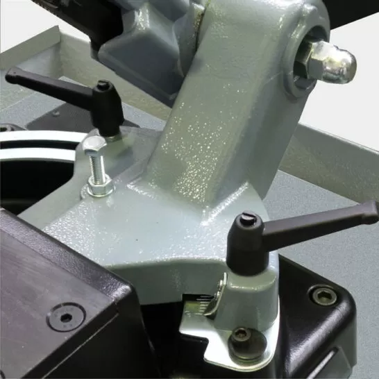 - Gietijzeren materiaalklem voorzien van Quick-sliding, schaalaanduiding en geleide steunen met rol