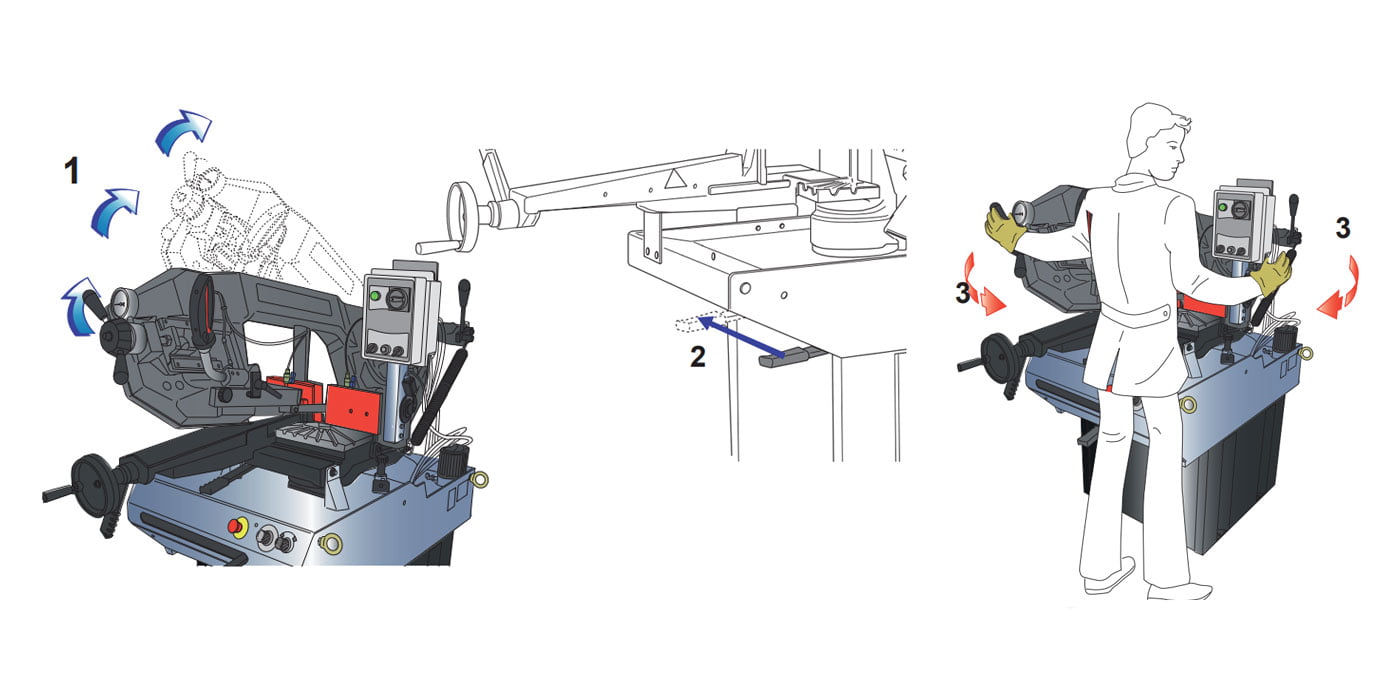 Op de hierboven afgebeelde foto’s kunt u goed het verschil in veiligheid zien. Op plaatsen waar mogelijk nog enig gevaar ligt voor de gebruiker is afgedekt of afgeschermd. Om te voldoen aan de CE-veiligheidsnormen heeft Femi de N257 DA DG dus voorzien van een aantal extra veiligheidsvoordelen ten opzichte van standaard bandzaagmachines, zoals: