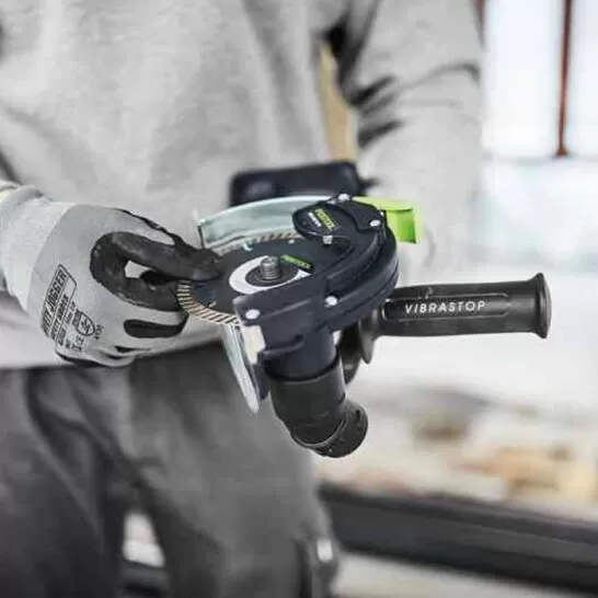 - Gezonder werken – Dankzij de afzuigkap wordt 95% het stof direct richting de mobiele stofzuiger getransporteerd. Ideaal voor het doorslijpen van minerale materialen, vooral in binnenruimtes.