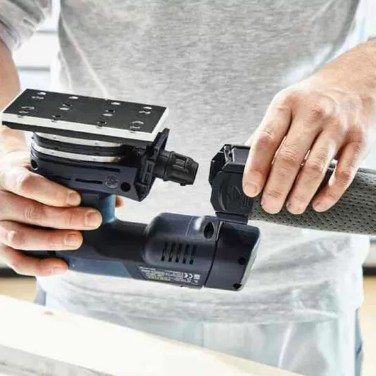 Daarnaast zorgt het ervoor dat bij het inschakelen van de accu-schuurmachine de stofzuiger in de modus AUTO automatisch start. Voor een onbegrensde looptijd kan het accupack worden ingeruild tegen de plug it-netadapter – ideaal voor stationair gebruik in combinatie met een Festool mobiele stofzuiger.