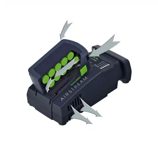 Eerst afkoelen, dan opladen. Met de nieuwe AIRSTREAM technologie gaat dit nu veel sneller. Want de nieuwe accu’s beschikken over een geïntegreerd koelkanaal, waardoor de afkoeltijd en dus het totale laadproces met wel 65% verkort wordt. Concreet betekent dit: sneller opnieuw te gebruiken – voor ononderbroken werken, ook bij energie-intensieve toepassingen zoals bijvoorbeeld zagen.