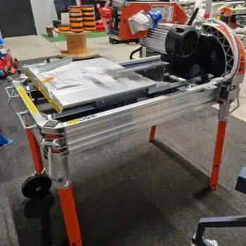 - ‘s Werelds eerste 350 mm steenzaagmachine met volledig geïntegreerde stofopvang heeft nu een zwaar uitgevoerd onderstel voor snelle en gemakkelijke mobiliteit.