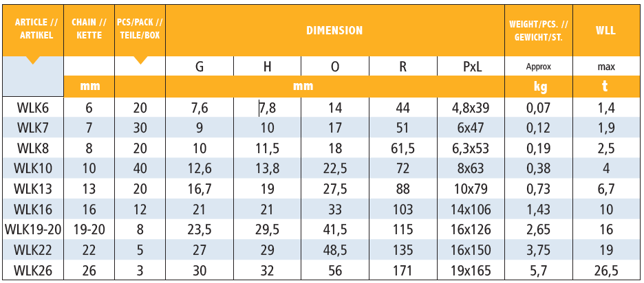 Kenmerken KITO WLK-Serie KW Grade 100 Verbindingsschalm – Diverse afmetingen