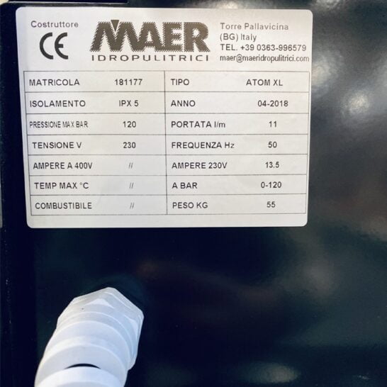 Kenmerken MAER Atom XL 120/11 Koud water hogedrukreiniger 230V