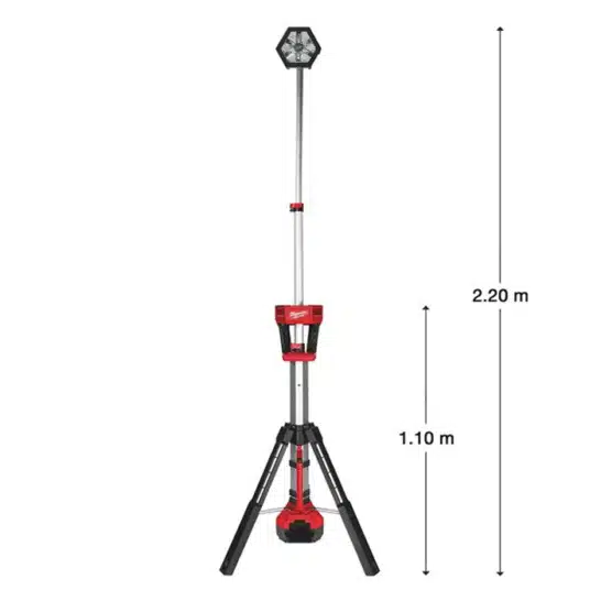 - Uitschuifbare mast van 1,10 m tot 2,20 m voor het verlichten van werkruimtes vanaf de bovenkant zonder schaduw