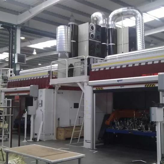 De FlexHood wordt vaak gebruikt als kap over een lasrobot/machine. De opstijgende lasrook wordt afgevangen en direct afgezogen via het randafzuigsysteem in de hoofdprofielen van het dak.