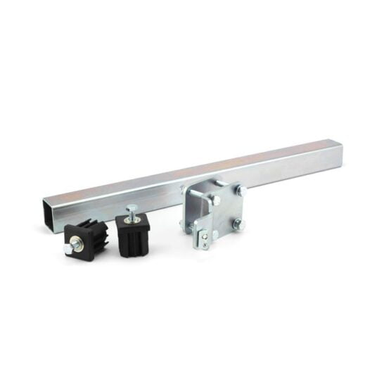 Deze montageset bestaat uit een koker 40×40 met een lengte van 500 mm die u zelf op de juiste lengte dient af te korten. Deze koker wordt voorzien van inslagdoppen met M8 inwendige schroefdraad die tussen de liggers van de bestaande baan dient te worden bevestigd. Dit gebeurd door middel van 2 boorgaten t.b.v. de M8 bouten die in de inslagdoppen worden vastgezet. Op deze koker wordt een lage profielsteun gemonteerd met behulp van de montageplaat en bouten, waarna het aluminium geleideprofiel op de lage profielsteun gemonteerd kan worden en in lijn gezet wordt met de materiaaldoorvoer.