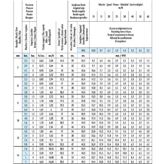 - Sproeibereik – 26,4 m – tot 57 m diameter (afhankelijk van nozzle, waterdruk, debiet en windsnelheden).