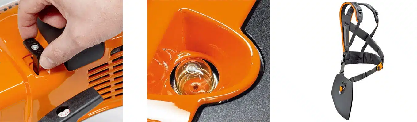 Bijzonder ergonomisch, comfortabel en licht. Voor moeiteloos maaien en hakselen. Uit te breiden met borstzak en rugzak voor gereedschap.