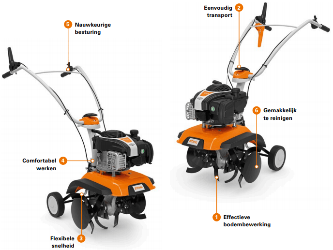 - Hakmessen – De hakmessen van de STIHL tuinfrees hebben een speciale vorm waardoor ze de grond heel doeltreffend omwoelen in een geoptimaliseerde volgorde.