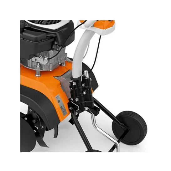 - Transportwielen – Om deze STIHL tuinfrees gemakkelijk te kunnen transporteren, is hij achteraan van een wielas voorzien. Tijdens het ploegen kunnen de wielen omhoog geklapt worden.