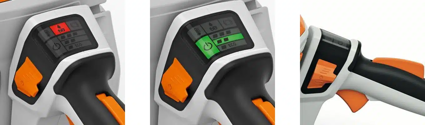 De led-display van de oliesensor geeft betrouwbare informatie over het niveau van de kettingolie. Als de led uit is, heeft de machine voldoende olie. Als de led rood kleurt, staat de olie te laag.
