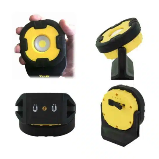 TAB88110 Accu LED werklamp, veel licht in vuistformaat. Krachtige 10W COB-LED werklamp vervaardigd van lichtgewicht slagvast ABS met siliconen beschermrand. De lamp heeft een brede stralingshoek van 110° met drie lichtstanden. Te gebruiken in diverse posities dankzij handige 180° draaibare lamp en zeer sterke bodemmagneet. Zeer compact dus gemakkelijk opbergen in iedere gereedschapskoffer of dashboardkastje. Voor gebruik binnen en buiten (IP65) en tevens plaatsbaar op statief.